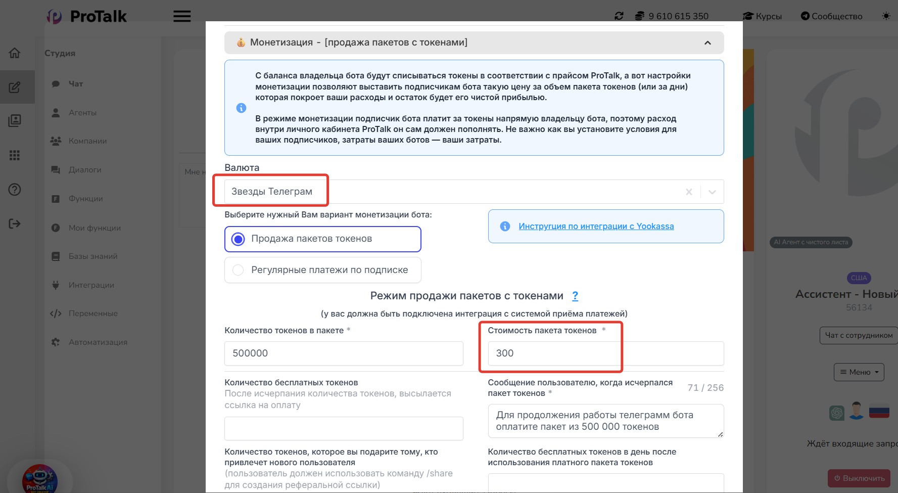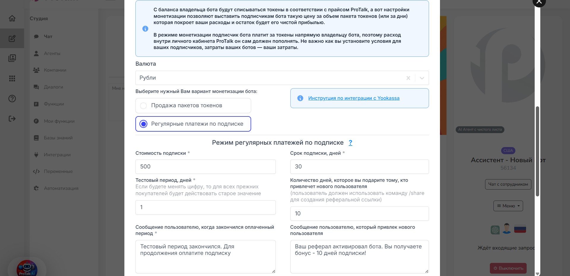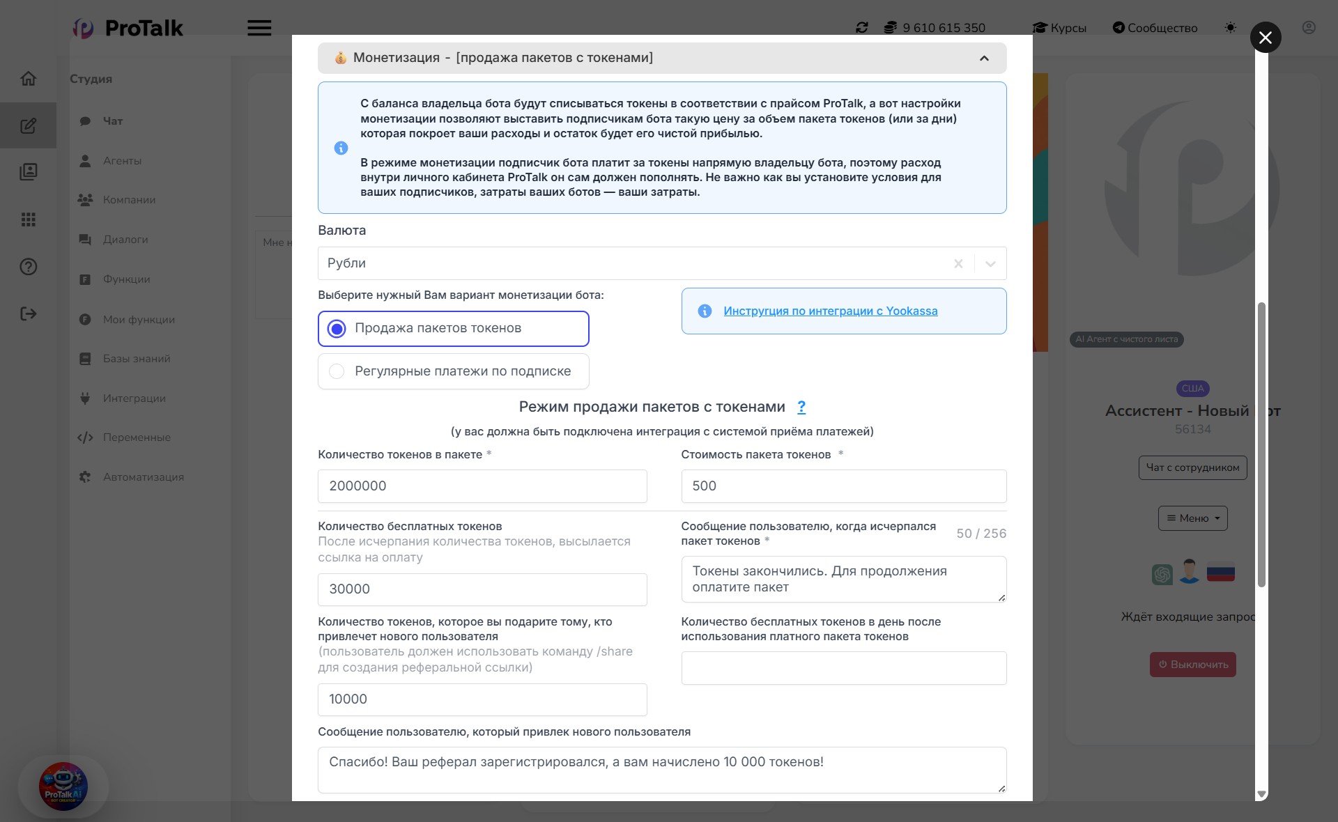 1. Откройте настройки бота в личном кабинете ProTalk и перейдите во вкладку «Монетизация».