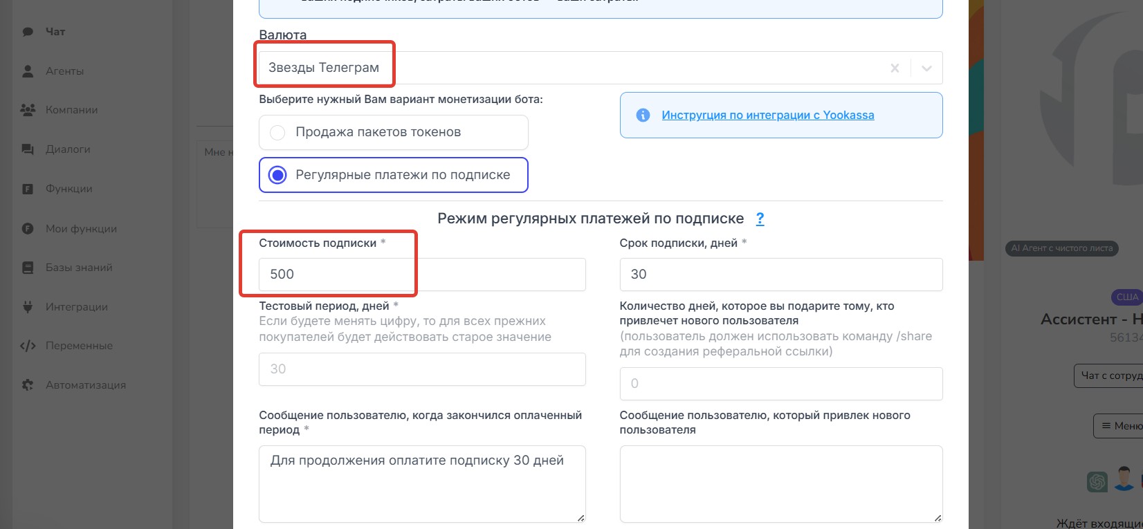 5. Сохраните настройки. При исчерпании токенов бот автоматически пришлет пользователю кнопку для оплаты Звездами.
